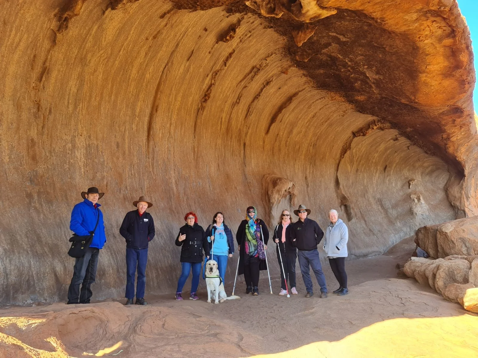Image description: A Cocky Guides tour group and a visitors guide dog stand for their picture with a backdrop of a historic rock formation that towers above them.