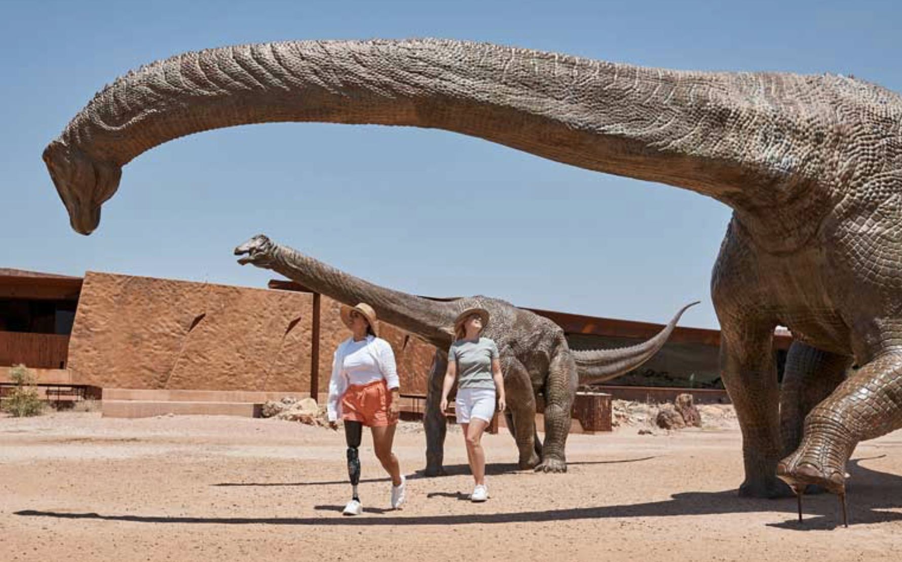 Image description: Two women and one with a prosthetic leg walk through a path with replicas of dinosaurs at Australian Age of Dinosaurs.